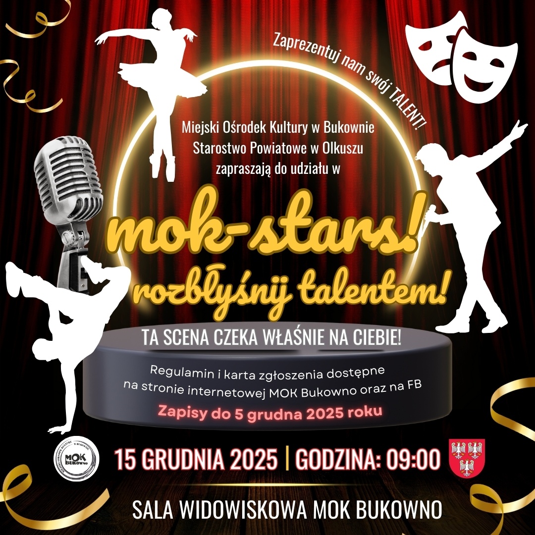 Z przyjemnością zapraszamy dzieci i młodzież do udziału w wyjątkowym Konkursie Talentów „MOK-STARS- rozbłyśnij talentem", organizowanym przez Miejski Ośrodek Kultury w Bukownie.